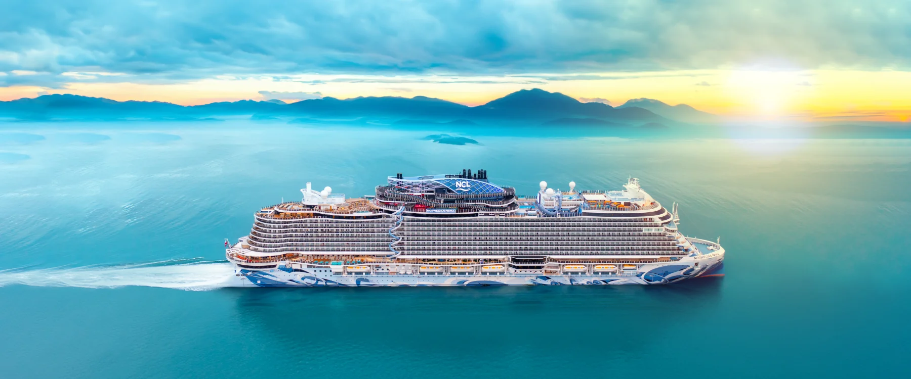 Blick über die Reling eines Kreuzfahrtschiffs auf das offene Meer. Die Kielspur des Schiffs zieht sich in die weite, blaue Ferne.