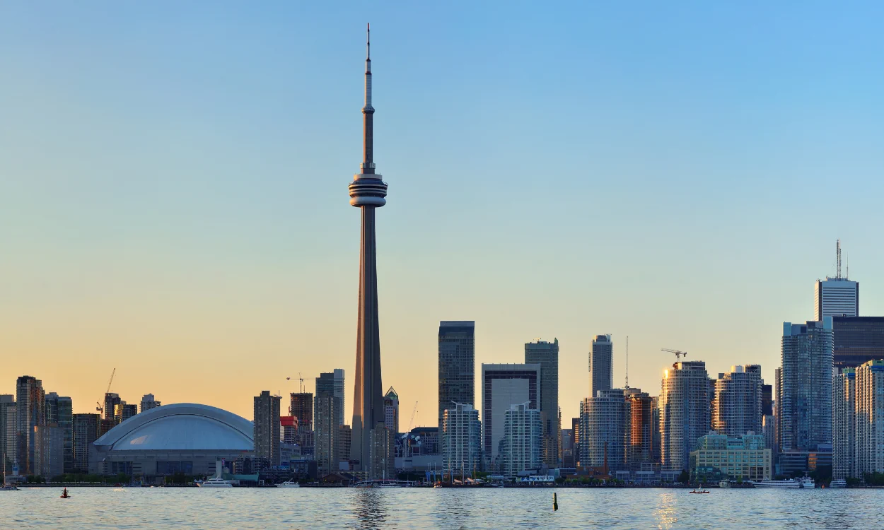 Eine Reihe von bunten Häusern mit Reetdächern am Ufer eines ruhigen Kanals an einem sonnigen Tag.